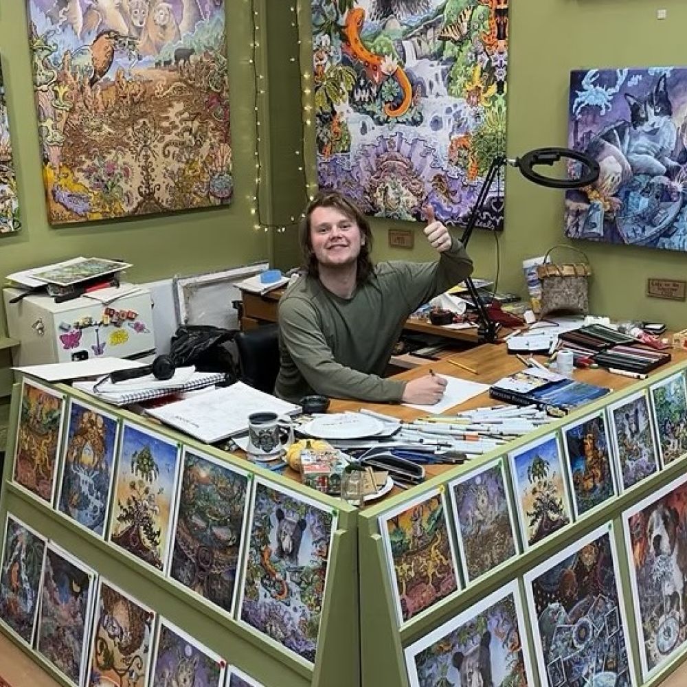 We’re thrilled to report that after months of recovery, Spencer has successfully navigated his rebuild and has found an incredible new home right here in the River Arts District. He has moved further from the water, safely across the railroad tracks to Pink Dog Creative. Here, he has settled into the large central studio in the “Big Room” alongside nine other talented artists. This new space has been a wonderful fit, providing him with a larger and more open studio environment perfect for his specific artistic process. Spencer’s distinctive work is all crafted using a vibrant mix of mediums, including watercolor, colored pencil, marker, and pen. He is a dedicated presence, often found in his studio creating new pieces. He warmly encourages anyone visiting the area to stop by and say hello anytime, a testament to the open and collaborative spirit of the River Arts District. You can see more of his unique pieces on his website.